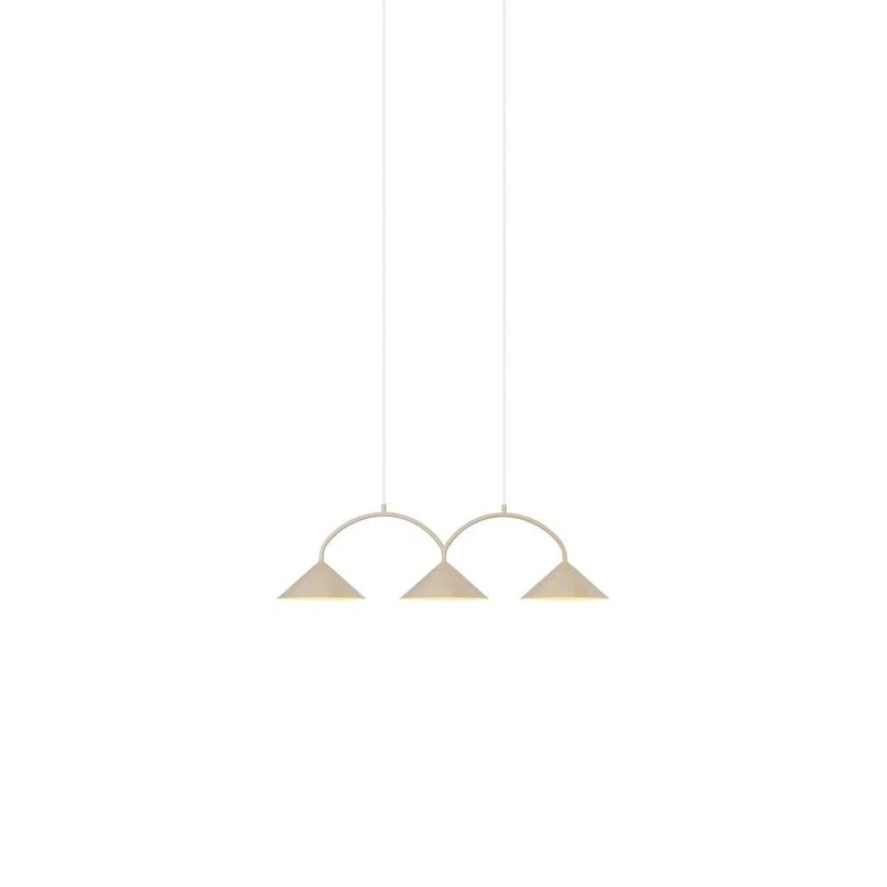 Visilica Curve 3 Beige cijenjena je zbog svog elegantnog, geometrijskog dizajna i širokog raspona osvjetljenja. Lampa se sastoji od nekoliko abažura koji svi imaju isti široki oblik šešira i međusobno su povezani prekrasnim lukovima po kojima je svjetiljka dobila ime. Abažuri su poredani u nizu i stoga mogu raspršiti svjetlost preko velike površine, čineći ovu visilicu Curve idealnim modelom rasvjete za blagovaonicu ili kuhinju. Ovdje je svjetiljka savršena iznad stola za blagovanje, kuhinjskog pulta, kuhinjskog otoka ili bilo kojeg drugog mjesta gdje je potrebno praktično osvjetljenje.