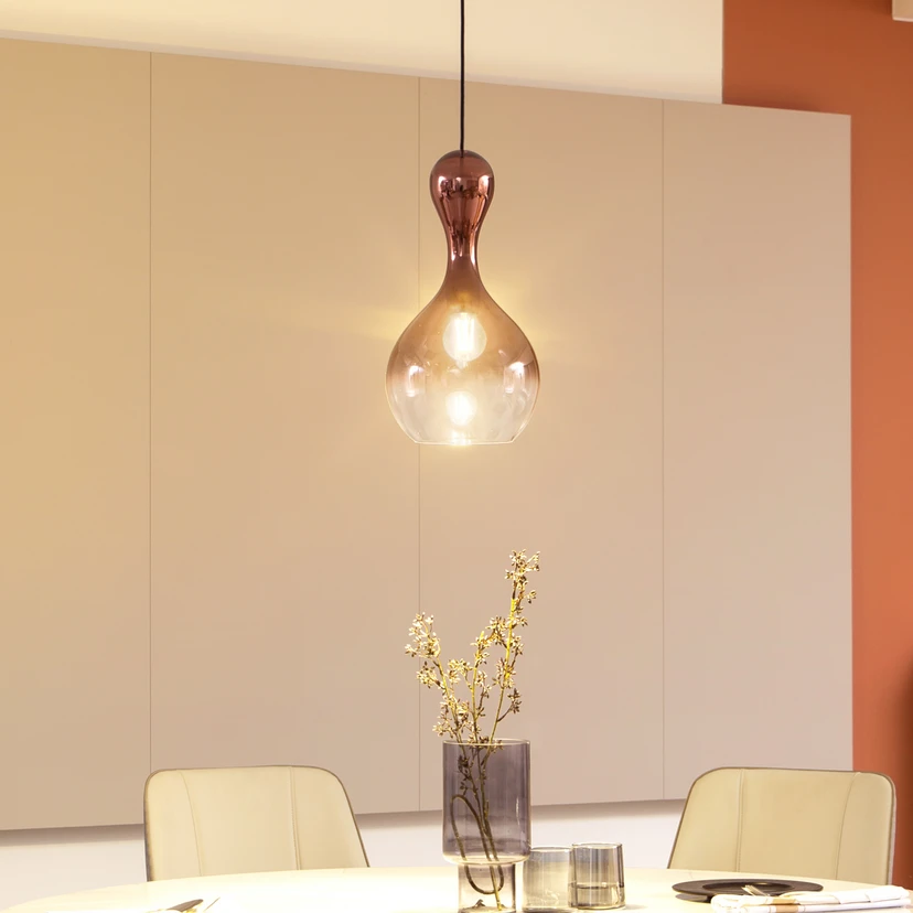Jednoplamenska viseća svjetiljka Lyrisa sa staklenim abažurom u lukovičastom izgledu i bakrenoj boji
