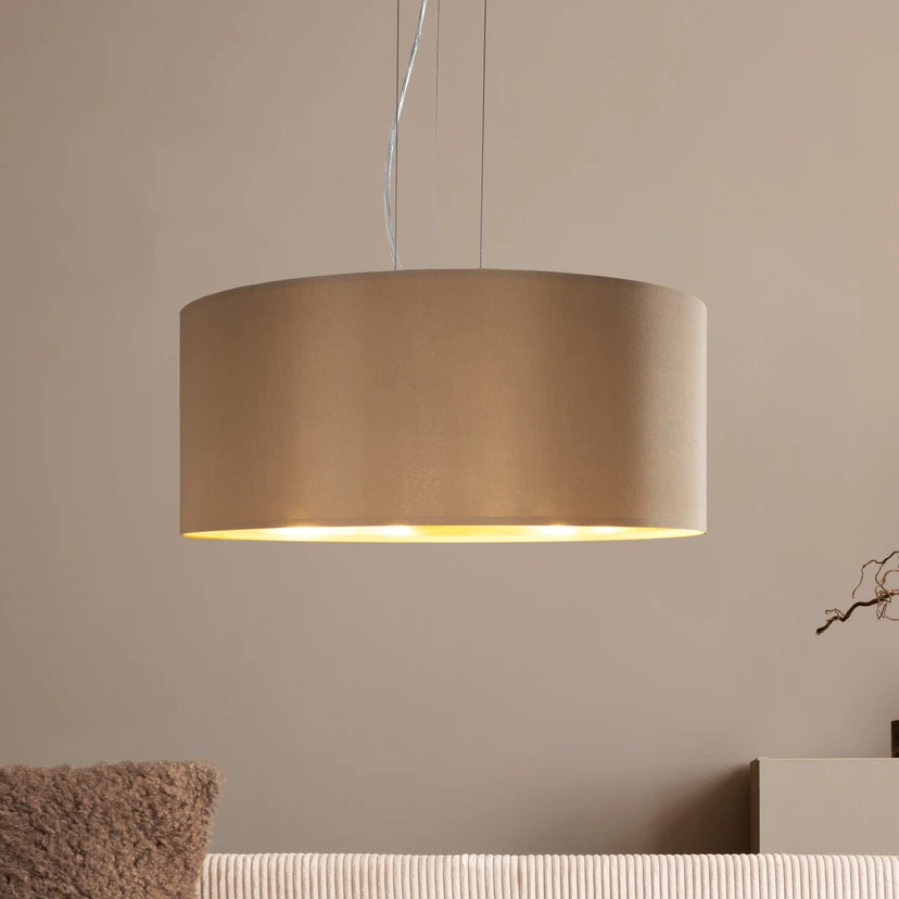Okrugla tekstilna viseća svjetiljka Maserlo, tamnosmeđe sjenilo, zlatna unutrašnjost