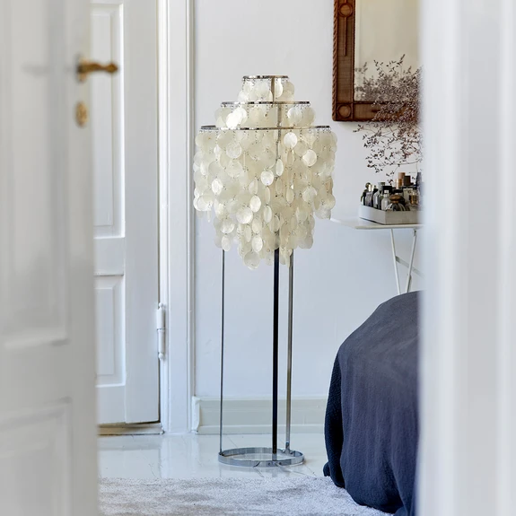 Sjenilo podne lampe Fun sastoji se od metalnog okvira s tri prstena s kojih vise diskovi školjki povezani malim ušicama. To stvara vizualni dojam kaskade. S jedne strane, emitirano svjetlo učinkovito naglašava diskove školjke, a s druge strane stvara vrlo ugodno dodatno osvjetljenje u dnevnim i spavaćim sobama.
