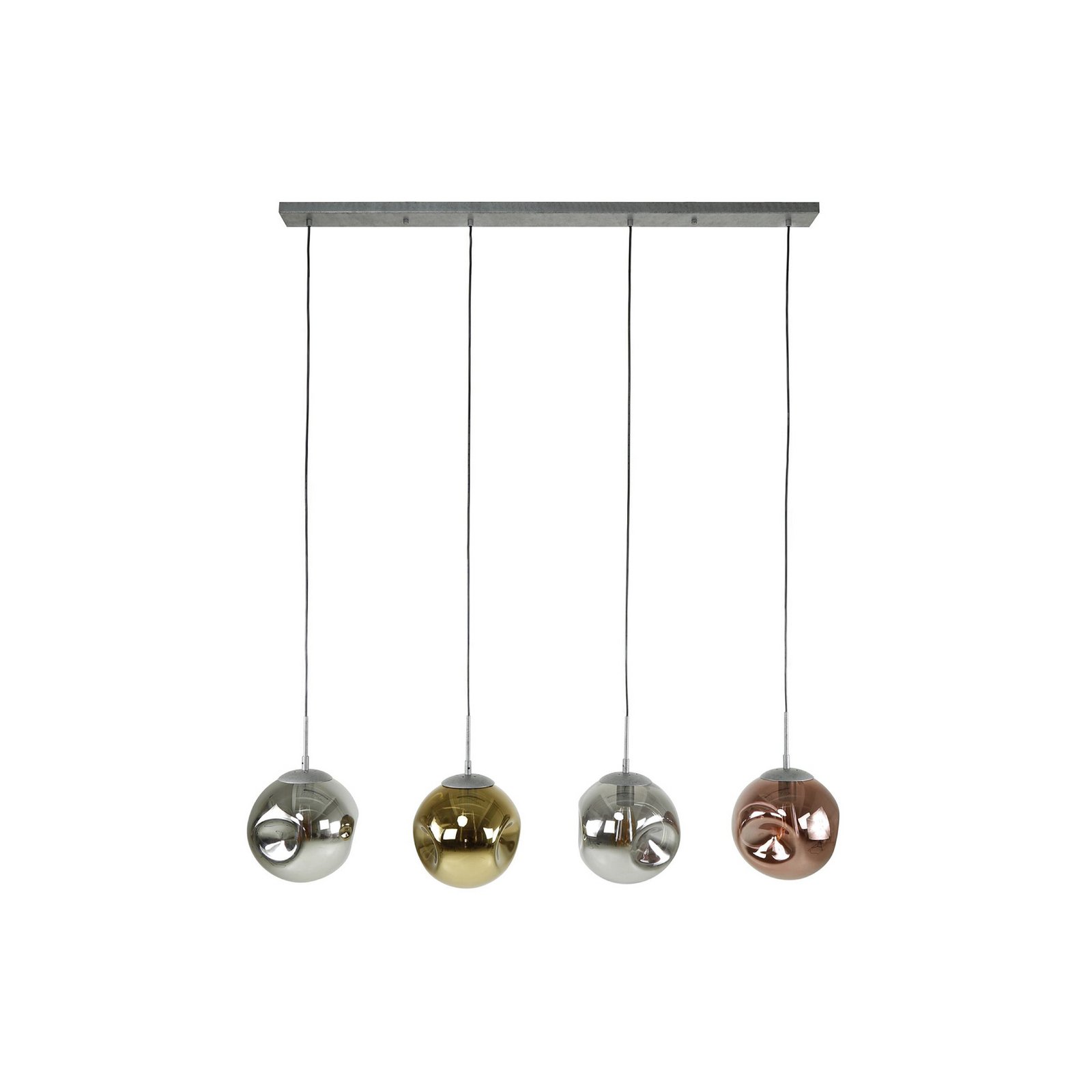 Stellar visilica s četiri staklena sferična sjenila Stellar visilica kombinira četiri sferična, elegantna staklena sjenila s kromiranim, zlatnim i bakrenim završecima i zanimljivim udubljenjima s robusnim metalom. Stvara fascinantnu igru svjetla koja svaku prostoriju uranja u moderan ambijent. Dizajn višebojnog stakla u kombinaciji s antiknim srebrnim elementima daje lampi bezvremensku eleganciju koja impresionira kako u blagovaonici tako iu dnevnoj sobi. Skladna paleta boja zlata, bakra, kroma i antiknog srebra stvara toplu i primamljivu atmosferu.