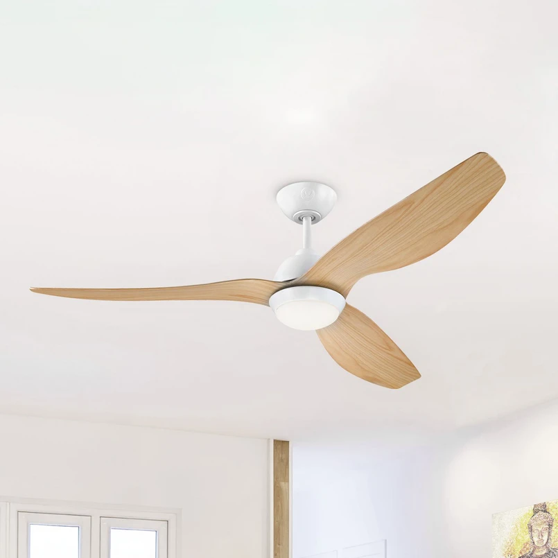 Ovaj LED stropni ventilator kombinira moderan dizajn s funkcionalnom rasvjetom. Tri lopatice izrađene su od ABS plastike u boji pustinjskog javora, čelično kućište je mat bijelo obojeno, a staklo lampe je opalno. Integrirani LED izvor svjetla pruža energetski učinkovitu rasvjetu, dok CCT funkcija omogućuje podešavanje boje svjetla od tople bijele do hladno bijele i dnevne svjetlosti. To stvara fleksibilnu atmosferu koja se prilagođava individualnim potrebama. Uključuje RF daljinski upravljač i vučnu uzicu.